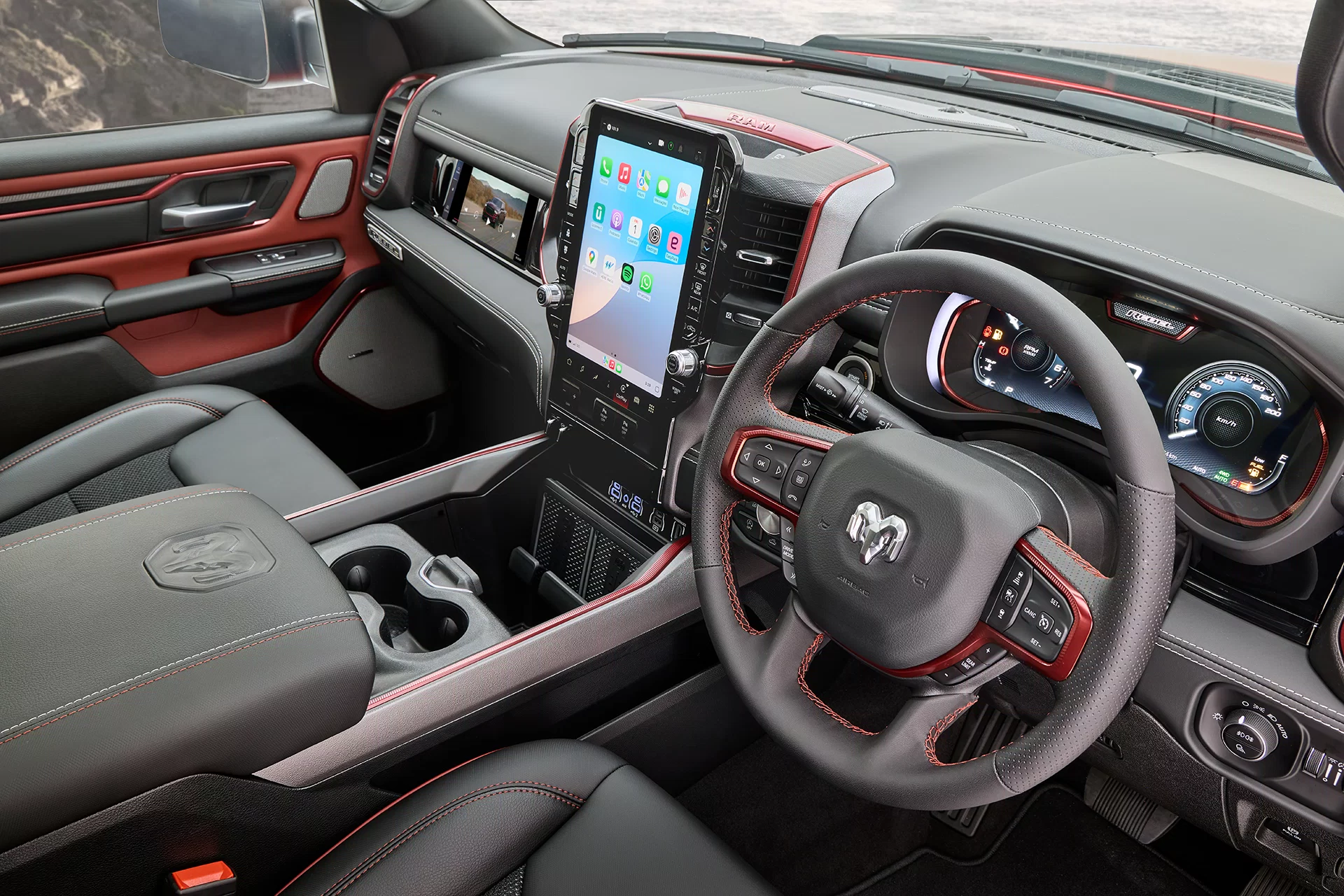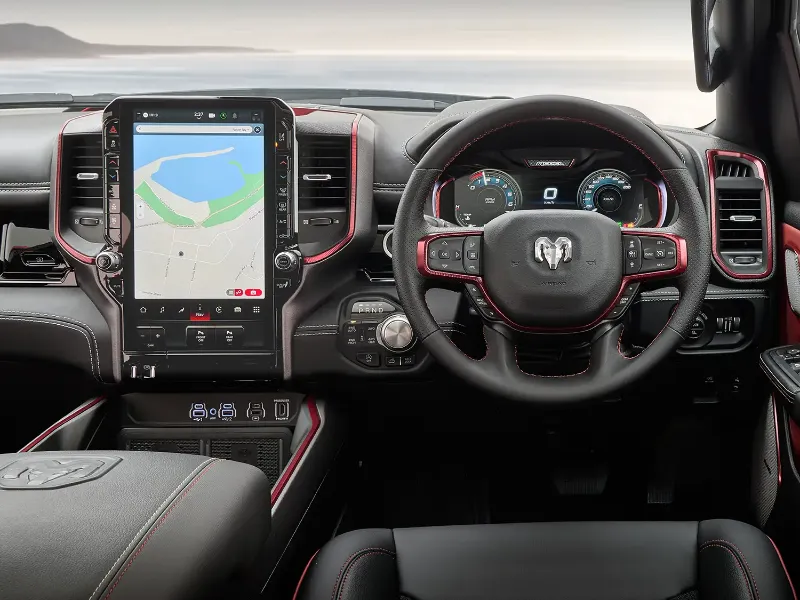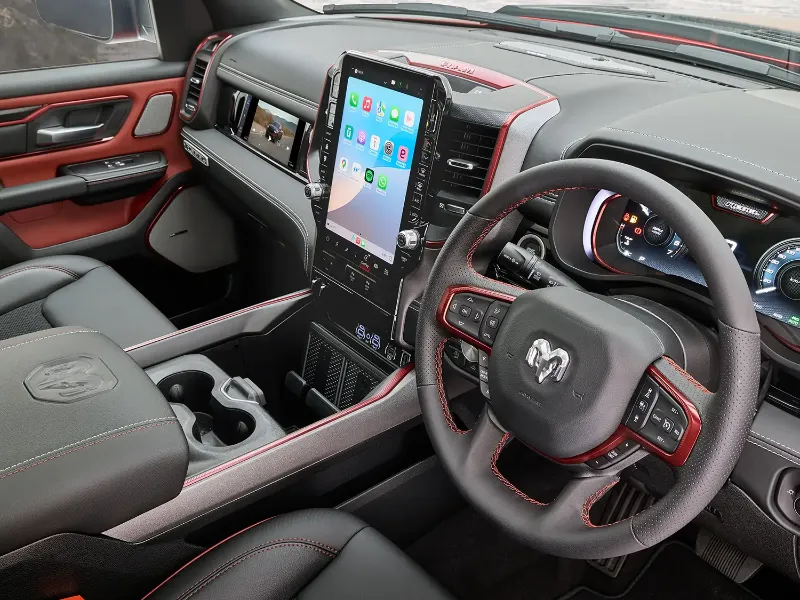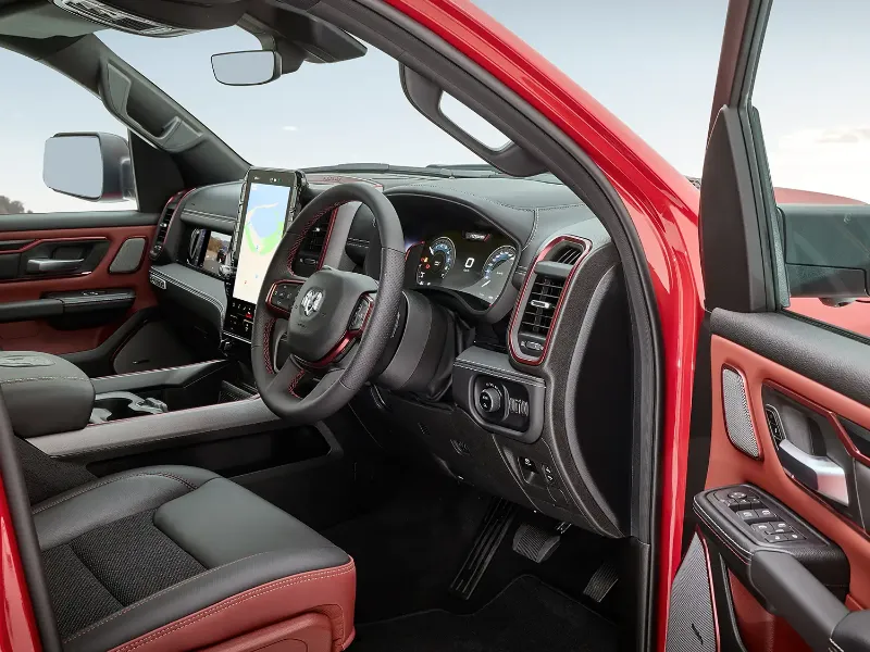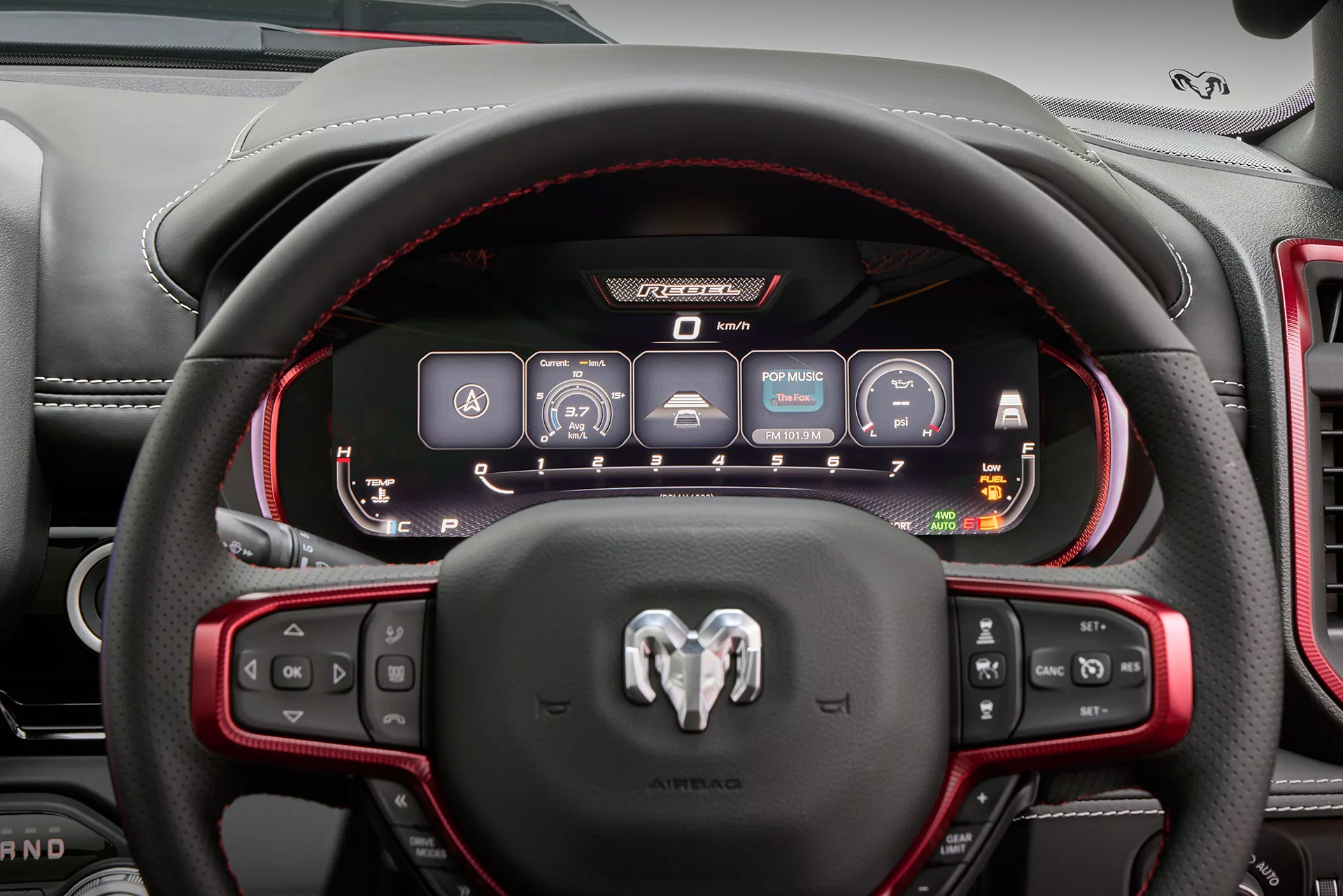 The Ram 1500 Rebel® Hurricane is loaded with an array of innovative and state-of-the-art technology combined with the Uconnect® 5 system to offer infotainment, navigation, and vehicle settings, all at your fingertips. What's more, the driver benefits from a new 12" digital cluster with full-colour 3D graphics and full screen navigation directly within your line of sight. Additionally, with colour-customisation and easy-to-see vehicle stats, this display can help boost your confidence behind the wheel. Inside the cabin, you will experience the powerful 900-watt Harman Kardon® sound system that features a total of 19 speakers*, ensuring an unrivalled entertainment experience in the cabin. Active noise cancellation and acoustic glass reduce ambient sounds to extremely low levels, further enhancing the in-cabin ambience.