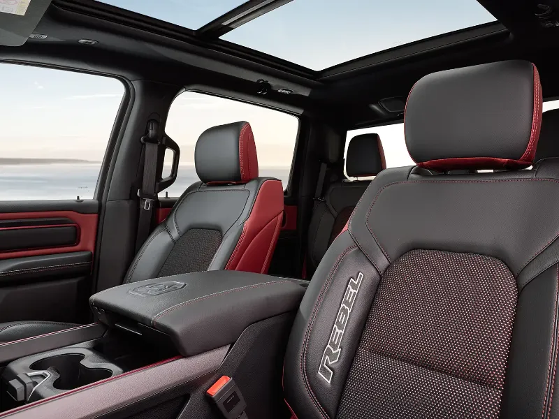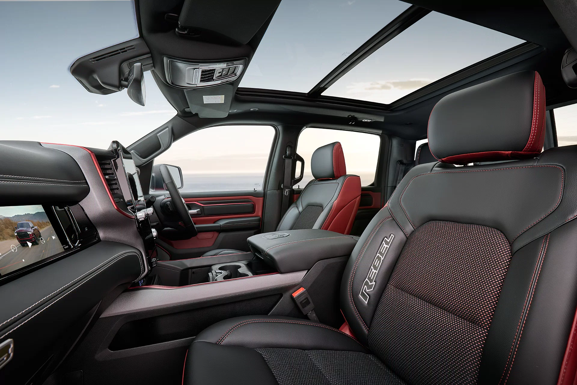 Once inside the cabin of the new Ram 1500 Rebel®, you’ll appreciate the thoughtful interior styling and plush partial leather-trimmed seats throughout. Driver and front passenger seats enjoy a captain’s chair experience with their smart-fold centre armrest, 8-way power-adjustable seats with lumbar adjustment, and 3 levels of heating and ventilation settings. Rear (outer seat) passengers also benefit from heating and class-exclusive manual rear-seat recline, something you won’t find in your average pickup truck. All passengers will appreciate and enjoy the electric panoramic sunroof giving a spectacular sky view and additional natural light.