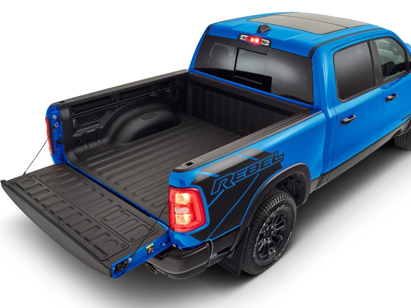 Access the bed of the 2025 Ram 1500 quickly and easily with the powered tailgate that opens and closes at your command with power up/down. Inside the tub, you'll find four tub fixed tie-downs and spray-in bed-liner to withstand even the toughest conditions.