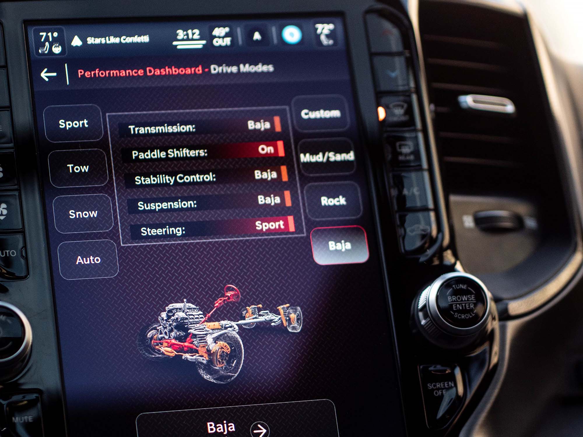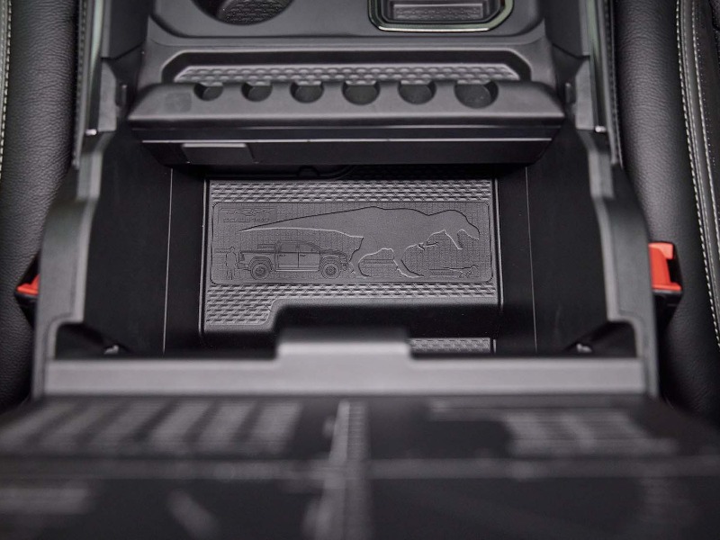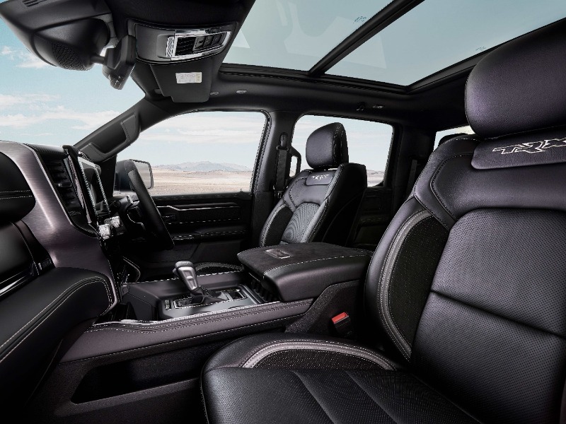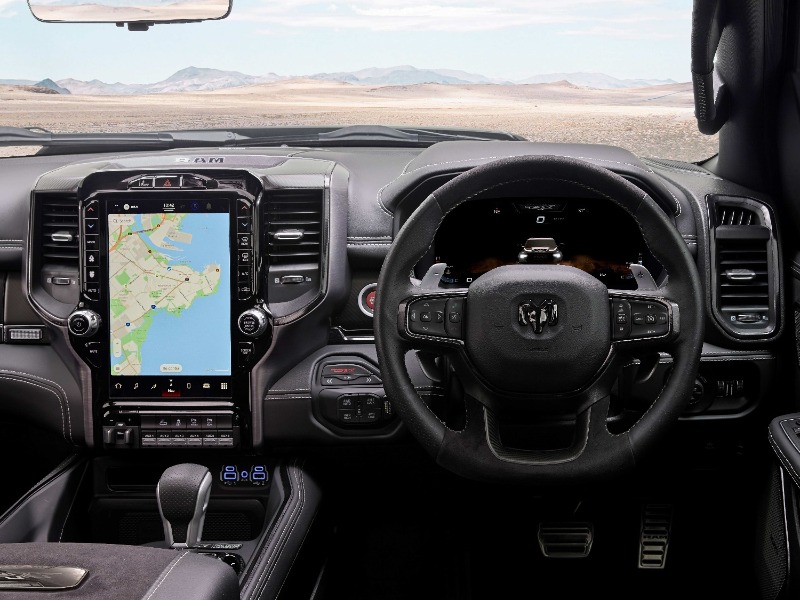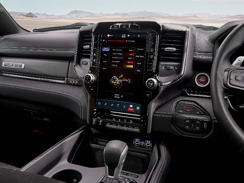 Offering no less than 8 dynamic drive modes, the TRX® utilises performance-tuned software to pre-configure and distinguish five on-road, and 3 off-road modes, allowing the driver to choose a setting that best fits the terrain around them. The drive modes separately control the four-wheel-drive system, throttle response, transmission, paddle shifters, suspension, and electric power steering. All modes use active slip control to prevent binding and excessive slip from front to rear. The on-road modes include Auto, Sport, Tow, Snow and Custom which allows the driver to personalise the vehicle’s performance with a selectable driving experience that offers a multitude of vehicle system combinations. Mud/Sand, Rock, and Baja modes take care of off-road expeditions. Both performance and off-road performance pages give drivers the tools to become familiar with their vehicle’s performance. Featuring for the first time on a RAM, real-time information such as timers, g-force, gauges, engine performance, ride height, pitch and roll are accessible through pages on the driver’s cluster, or via the class-exclusive portrait 12” touchscreen display.